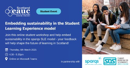 We are pleased to announce that sparqs is collaborating with EAUC Scotland and SOS-UK to develop the Sustainable Development lens of the Student Learning Experience model. This work will help to raise the profile of Sustainable Development as a key feature of the learning experience of students.